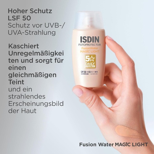 کرم ضد آفتاب فیوژن واتر رنگی دارای SPF50 ایزدین، از پوست در برابر اشعه UV آفتاب محافظت می‌کند، همچنین کلاژن موجود در این محصول سبب کاهش چین و چروک می‌شود.